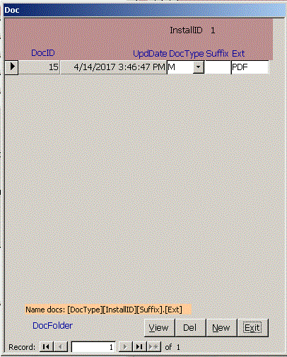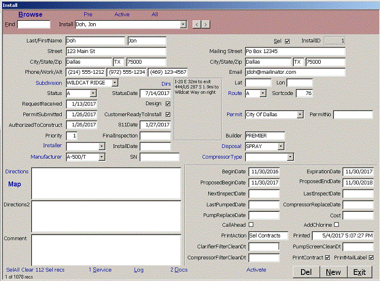 Find in | InstallID | LastName, FirstName | Builder | Phone | Phone2 | WorkPhone | Street | City | Zip | Comment | SEL |. Use the pipe symbol (vertical | bar) to separate multiple fields or mark the start or end of a field and reduce false hits. Find for |SEL| to see records where the Sel checkbox is checked. You can use wildcard characters in the Find box. ? matches any single character and * matches 0 or more characters. The record counter in the lower left of the form shows how many records you have found. Click the Find box to clear it and find all records again. SelAll sets the Sel checkbox in all records in the found recordset to true. Clear x SelRecs sets them to false. These features are additive so you could find for Dallas, SelAll, find for Fort Worth, SelAll and repeat the process Arlington, Fort Worth, Irving, Plano, Carrollton, Denton, Frisco, Grand Prairie, McKinney, Mesquite and Richardson to find the larger cities in the DFW metroplex. Similarly, you could find |Smith|, Clear x Sel Recs, find |Jones|, Clear x Sel Recs and exclude all whose last name was either Smith or Jones. If you don't mind also clearing 2013 BlackSmith Way, you could omit the pipe symbol delimiters. By entering keywords in the Comment field, you can quickly select marketing groups for your business. You can use the complex selections to create reports, export data, delete or edit records. You can't change InstallID, the auto number primary key, so it is grayed out. Phone has an input mask to show the phone number correctly and consistently. The blue Subdivision label for the Subdivision combo opens the Combo form so you can add or edit new values. When you pull down the combo box, the changes to the Combo table appear. By typing in the field, you can move to the first value in the combo that begins with the string you typed. Likewise, you can edit values Installer, Manufacturer, Route, Permit, Disposal or Compressor Type by clicking the blue link to the left of that combo. The blue Directions link opens Google Maps to show directions from the home office specified on the Setup form to the customer's street and zip. The blue Map link shows a Google map of the area. If you enter an exclamation point ! in the Comment field, it is highlighted yellow. This helps the user remember to ask a question while the customer is available. The Del button is reserved for users with Super user access. Del also delete related records in the Service, Log and Doc tables. It is easy to add a bulk delete feature to delete all Sel records or to add a password to restrict deletes to all but a few users. The blue Service, Log and Doc links at the bottom of the form show how many related records there are. If you click the link or press Alt and the underlined letter, like D for Doc, the related form opens with the recordset filtered to show only those records related to the current InstallID. If if a form is related to a parent form and that form isn't open, the New button will be disabled.