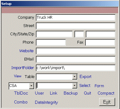 Click Setup on the Main menu to see the Setup form. Enter your company contact info and ImportFolder.
