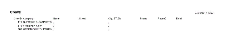 Crew - CrewID, Company, LastName/FirstName, Street, City/State/Zip, Phone, Phone2, EMail by LastName