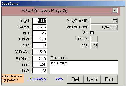 Click the BodyComp link at the bottom of the Patient form to open the Body Composition Form to the most recent record. PgDn to move to previous BodyComp records or PgUp to move to the next record. Summary shows a report of all BodyComp records, View shows all fields of the current record. Gender and Age are copied from the Patient form. This form is designed for the MS Access weight loss clinic database.