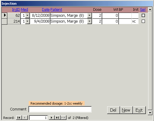 Click Injection on the Patient form to open the Injection Form. Verify the Med, date, patient and dose that are automatically added. Enter the weight, blood pressure and your initials.