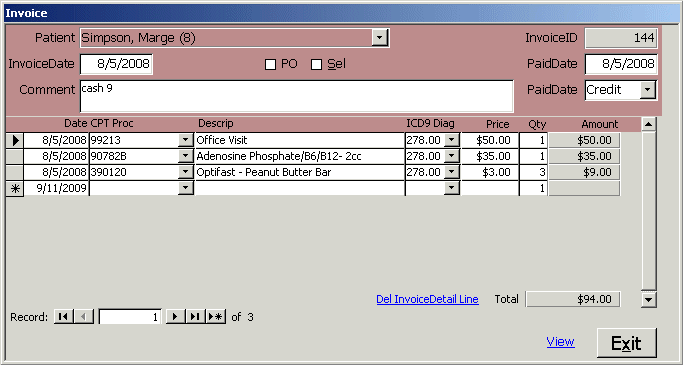 Click Edit or double click a record on the Invoices form to open an Invoice Form. Add data to the last detail line or click DelDetailLine to delete a line. If you are purchasing supplies from a vendor, check the PO box. You can enter the ICD9 diagnostic code for each detail line. If you sell weight loss supplies, you can enter them too. Double click the Invoice Date to show you have no more detail lines to add. Double click the Paid Date when the invoice is paid. Enter the method of payment and use the comment field if two methods are used. Click the View link to see a printable invoice.