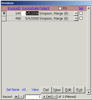 Click Invoice at the bottom of the Patient form to open the Invoices Form. The number of invoices is shown in the link. You can create a new invoice for a patient from this form or from the New Invoice link on the Visit form. Use the Sel checkboxes or SelAll link to select invoices to print from the Report form if the patient needs another copy.