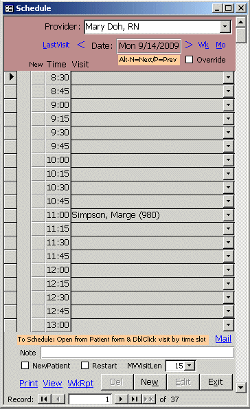 Click Schedule on the Patient or Setup form to open the Schedule Form. The patient's default provider is selected, but you can choose another doctor, nurse or provider if you like. Use the < and > links to move back or ahead a day. Days not normally scheduled are skipped unless you check override. You can use Alt-N (Next) or Alt-P (Previous day) too. Click Wk or press Alt-K to move ahead a week. Click Mo or press Alt-M to move ahead a month. Click LastVisit or press Alt-L to jump to the most recent visit for the patient. Click again for the visit before that. To schedule a visit, double click the time slot. A record in the Visit table will be created at this time. To remove a visit from the schedule, delete that Visit record. You can set the office hours for each day for each provider's schedule on the Setup, Office Hours form. The interval on the Office Hours form lets you block time as short as 15 min for each visit or multiple blocks of time. If you haven't schedule a visit for a new patient, the provider will default to New Patient. Note the N's in the New column. These are the recommended times to schedule a new patient visit. By default, the new patient visit will schedule 45 min with the New Patient provider, a 30 min break to watch a video and 45 min with the patient's default provider. If there is a conflict, you will be warned. X's in the Prv column advise you that the time for a new patient is not available because there will be a conflict for the other provider. The provider must check the Override box to schedule visits outside normal office hours. If a patient has missed enough visits, check New Patient or Restart to schedule time to catch up labs and paperwork. By default, restarts schedule 30 min with the New Patient provider followed by 15 min with the patient's primary provider. Click the Mail link to email an appointment notice to the patient. Click Print to print the daily schedule, or View to view it on screen. Click WkRpt to view the provider's schedule for the entire week. Double click any schedule record to edit the Visit record for that time.