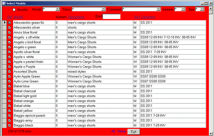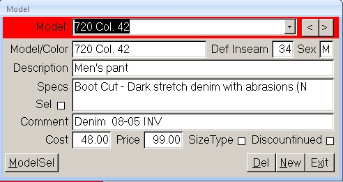 Click Model Sel to open the Model Sel form. Use the Find box or Model, Desc, Comment, Inseam and Sex combos