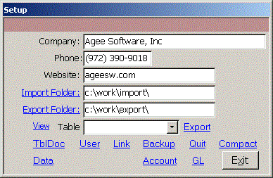 Click Setup on the Main menu to see the Setup form. Enter your company contact info and ImportFolder.