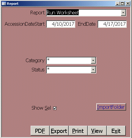 Run Worksheet reports accessions within a date range. You may select a Category or Status or Show Sel.