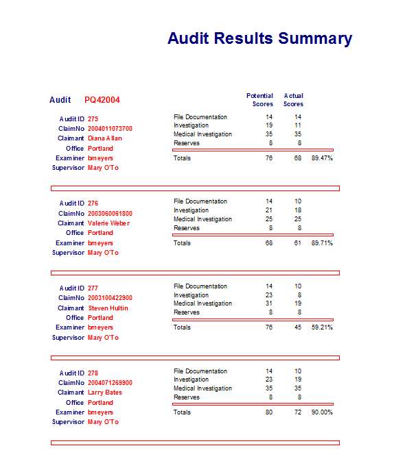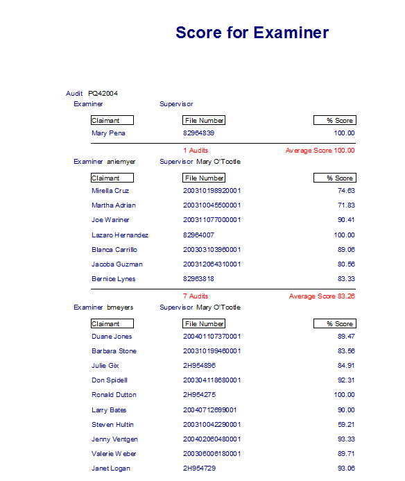 Scores are based on the weight and number of questions answered Yes. You can select one or all Audits and one or all Examiners.