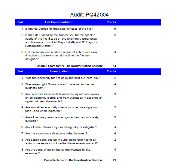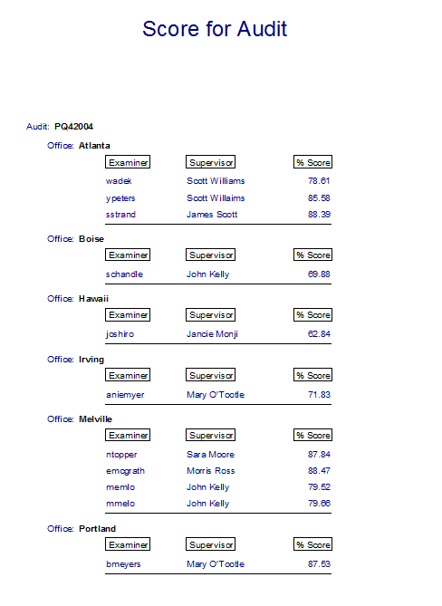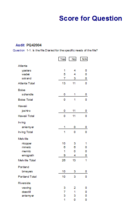 This lists Score by Question for one or all audits, offices and questions.