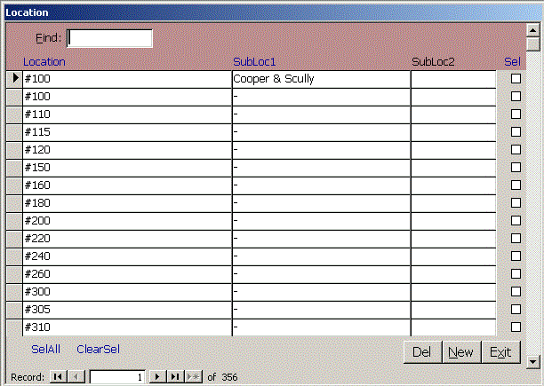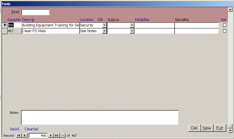 | EquipNo | Descrip | Location | SubLoc | ModelNo | SerialNo | Notes | SEL |. Use the vertical bars to specify the