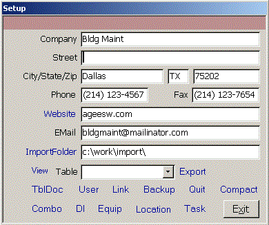 Click Setup on the Main menu to see the Setup form. Enter your company contact info and ImportFolder.
