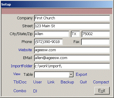 Click Setup on the Main menu to see the Setup form. Enter your church contact info and ImportFolder.