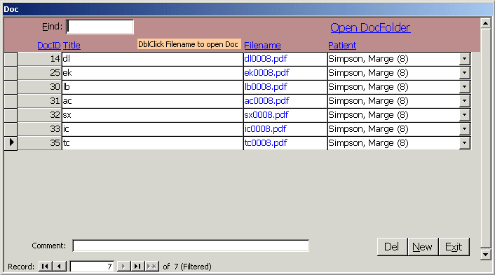Click Doc at the bottom of the Patient form to open the Doc Form. Scan the document using the File button on the scanner. After the last page, press the Finished button on the scanner to save the document as 0.pdf in the DocFolder (set on the Setup form). Enter a two character code such as DL for Driver License, EK for EKG, LB for Labs or TC for Treatment Consent to create a link and rename 0.pdf to include the PatientID for that document. You can also manually enter a title and filename. The OpenDocFolder links you to the scanned document folder to manually rename documents if necessary. When opened from the Patient form, you'll only see docs for that patient. From the Setup form, you'll see docs from all patients in the medical office. Find works similar to the Patient form Find except it finds strings in |DocTitle|DocFile|Comment|.