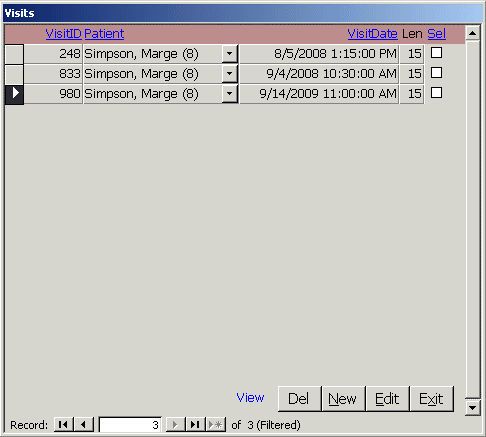 Click Visit from the Patient form or Setup form to open the Visits Form. You will be alerted if the patient is missing critical paperwork. Click the VisitID, Patient, VisitDate or Sel to sort by that field. Click again to sort in descending order. This works for any blue links at the top of a column throughout the application. Click View to manage the Visit report.