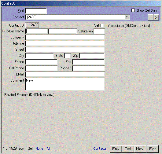 In the lower left, above your Start button, is status bar text that says: Find in ~ FirstName ~ LastName ~ Company ~ JobTitle ~ Street ~ City ~ Zip ~ Phone ~ Fax ~ EMail ~ Comment ~. Use the tilde ~ to separate multiple fields or mark the start or end of a field and reduce false hits. Projects related to this contact are shown below the Comments field. Click Contacts at the bottom of the form to open the Contacts form. Click the blue link at the top of the field (ContactID, Last Name, Job Title, Company, Street, City, State, Zip or Phone) to sort by that column. Click the link again to sort descending. |