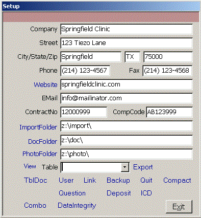 Click Setup on the Main menu to see the Setup form. Enter your company contact info and ImportFolder.