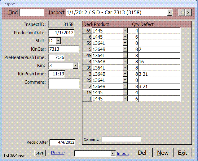 Enter ProductCode, Qty and Defect for each deck of the kiln car. Separate defect codes by spaces. Click Recalc before running reports to move the quickly entered defect strings into relational tables.