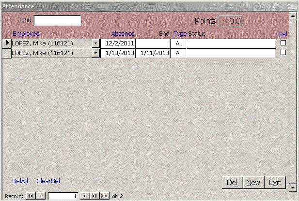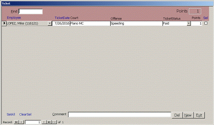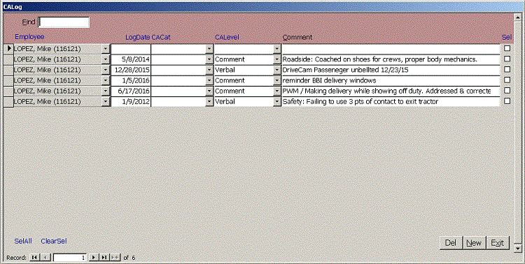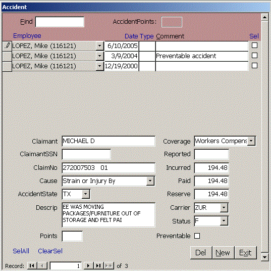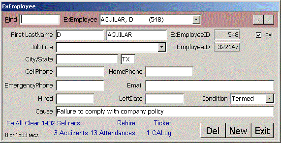In the lower left, above your Start button, is status bar text that says: Find in | (ExEmployee)ID | EmployeeID | LastName, FirstName | City | Condition | Cause | LeftDate | SEL |. Use the pipe symbol (vertical | bar) to separate multiple fields or mark the start or end of a field and reduce false hits. Find for |SEL| to see records where the Sel checkbox is checked. To find all employees who quit, find for Quit. Find for 1 would return ID or EmployeeID 1, 11, 12, 21, 31. To limit the records returned, Find for |1|, which would find only fields that were exactly 1. You can stack Finds together using the * wildcard that matches any number of characters or the ? that matches any single character. To Find all job title drivers from Dallas, Find for |Dallas|*|Driver|. The order of fields is important, but case is not. The record counter in the lower left of the form shows how many records you have found. Click the Find box to clear it and find all records again. The F on Find is underlined to show it is a hotkey, so Alt-F from the keyboard works the same as clicking the Find box. The ExEmployee combo lets you pick a specific ExEmployee. You can use the < Prev and > Next buttons in the upper right corner of the form, or use the PageDown and PageUp keys to navigate through the recordset. SelAll in the lower left corner of the form sets the Sel checkbox in all records in the found recordset to true. Clear x SelRecs sets them to false. These features are additive so you could find for Dallas, SelAll, find for Fort Worth, SelAll and repeat the process Arlington, Garland, Irving, Plano, Carrollton, Denton, Frisco, Grand Prairie, McKinney, Mesquite and Richardson to find the larger cities in the DFW metroplex. Similarly, you could find |Smith|, Clear x Sel Recs, find |Jones|, Clear x Sel Recs and exclude all whose last name was either Smith or Jones. You can use the complex selections to create reports, export data, delete or edit records. As you tab through the fields, the status bar text above the Start button changes to show what is expected in that field. Fields like Region and WH may be grayed out if you don't have the right to change them. To enter dates in the current year, type month/day, like 7/27 for July 27. You can enter the year like 5/2/1980 for May 2, 1980. Click the calendar to the right of the date field to choose the date from a calendar. The numeric + adds a day and the numeric - subtracts a day from the date shown. DoubleClick to set the date to today or clear the date that is entered. Click the blue Rehire label to copy the record back to the Employee table. Once you enter the DLNo, that field is hidden for that record. To view the DLNo, click the blue If there are related records for the ExEmployee, such as Accidents, Attendances, CALogs or Tickets, you will see a blue link that says Accident if there were no related accidents or 3 Accidents if there were three accident records. The Del button is reserved for users with Super user access. You must enter a password to delete the ExEmployee. It then asks if you want to delete the related Accident, Attendance, CALog and Ticket records. Finally, it asks if you want to delete the Applicant record.